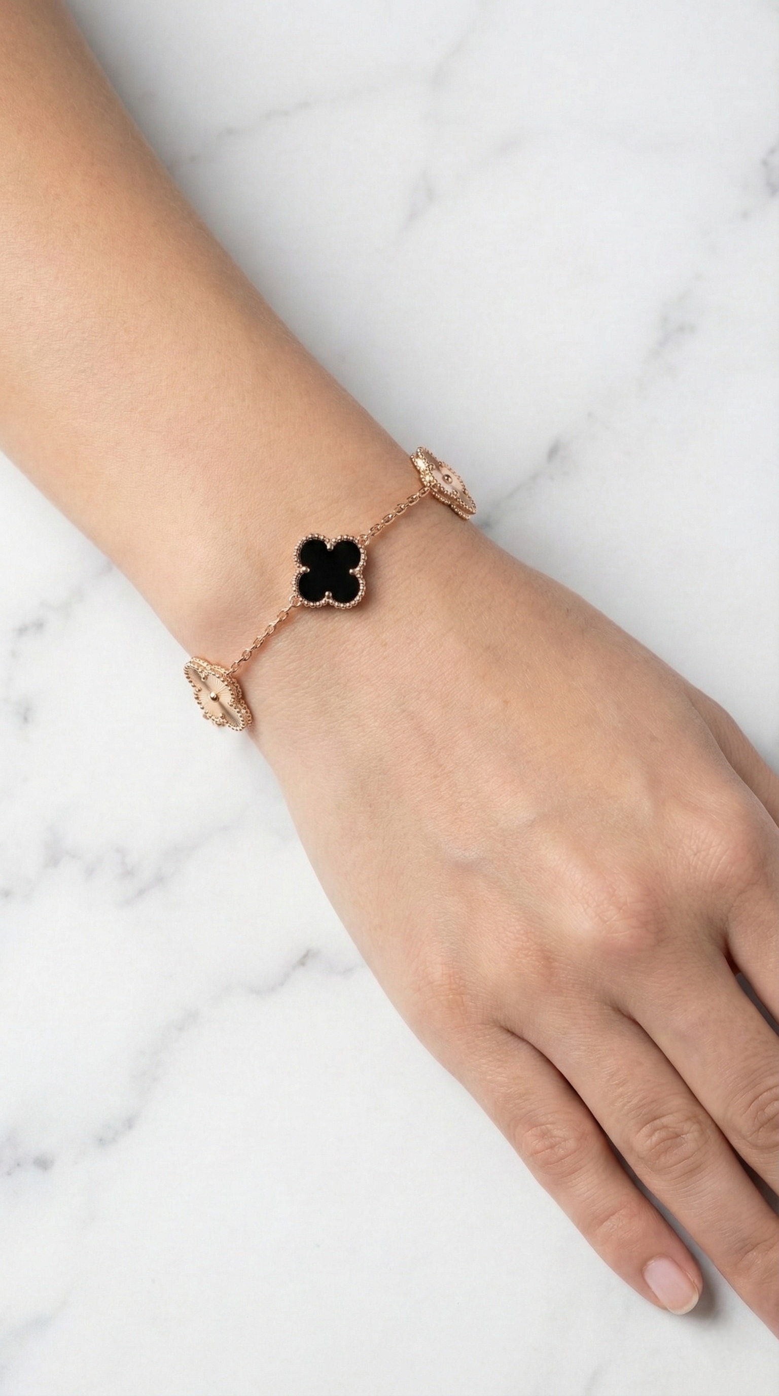 FREE SHIPPING 🎊 Anti tarnish stainless steel Timeless elegance meets modern charm with this clover-inspired bracelet from our Limited Jewellery collection. Crafted in a refined gold-tone finish, the bracelet features a striking black clover centerpiece that symbolizes luck, grace, and sophistication. Designed for effortless everyday wear, its delicate chain and polished details make it perfect for both casual outfits and special occasions. A subtle statement piece that adds instant luxury to your look. Why You’ll Love It: Classic clover charm with black enamel finish Premium gold-tone chain Lightweight, comfortable & skin-friendly Adjustable fit for a perfect wear Elegant enough for daily and occasion wear